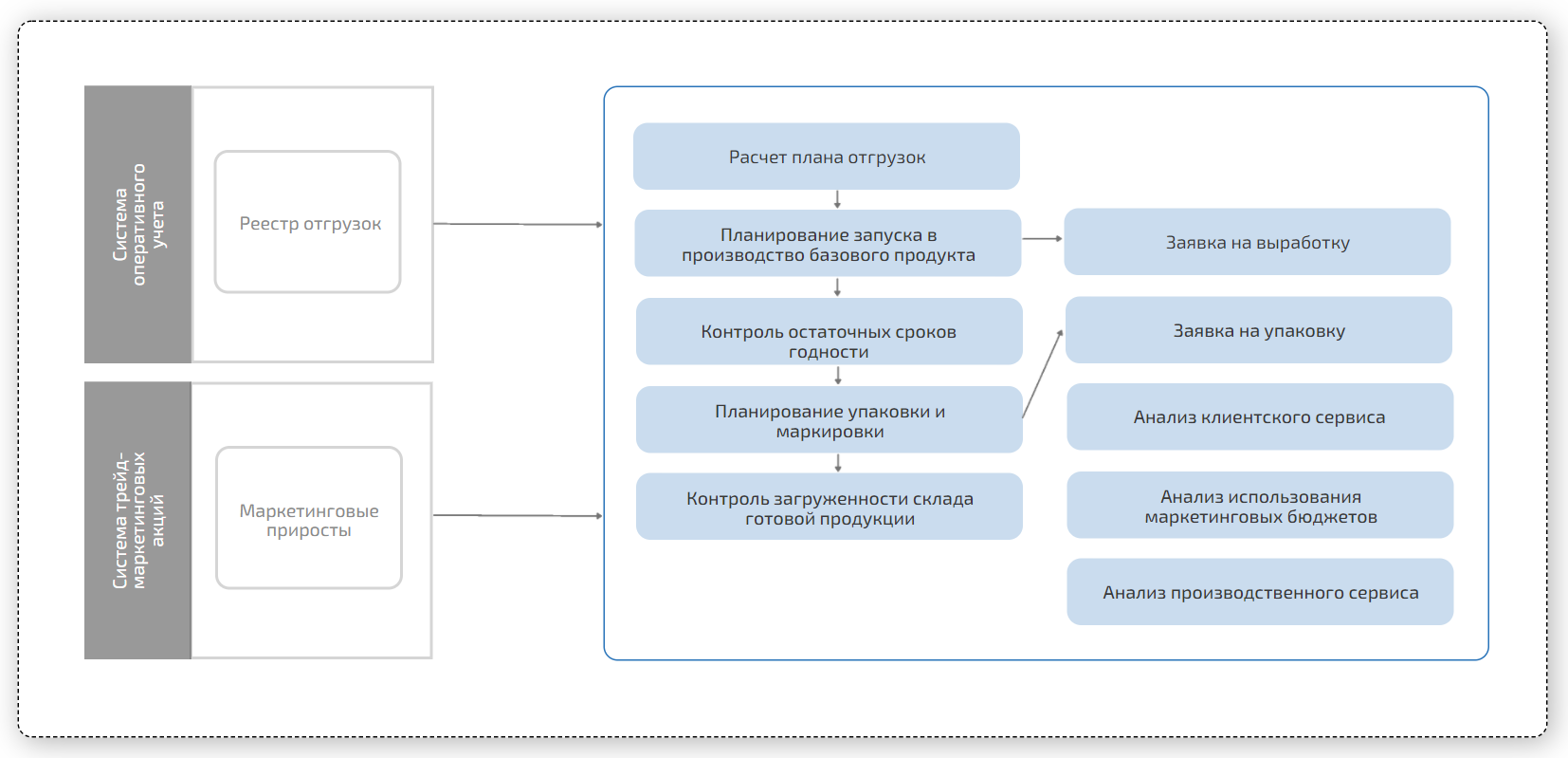 Для наиболее точного прогнозирования отгрузок используются две стратегии. Первая - построение прогноза отгрузок на основании истории продаж, акционных приростов, заказов покупателей и фактических остатков. Вторая - расчет ближайших отгрузок на основании заданных правил. Точный прогноз отгрузок на горизонт планирования позволяет дать корректное задание для запуска в производство, чтобы успеть выполнить все заказы клиентов вовремя.